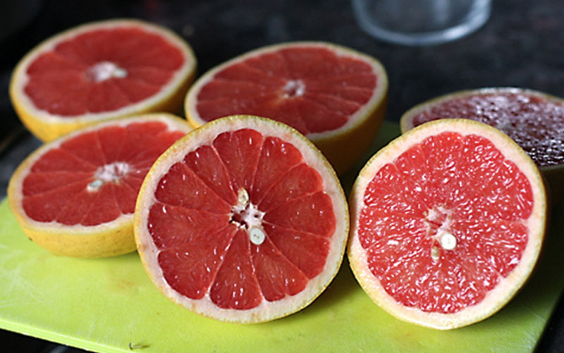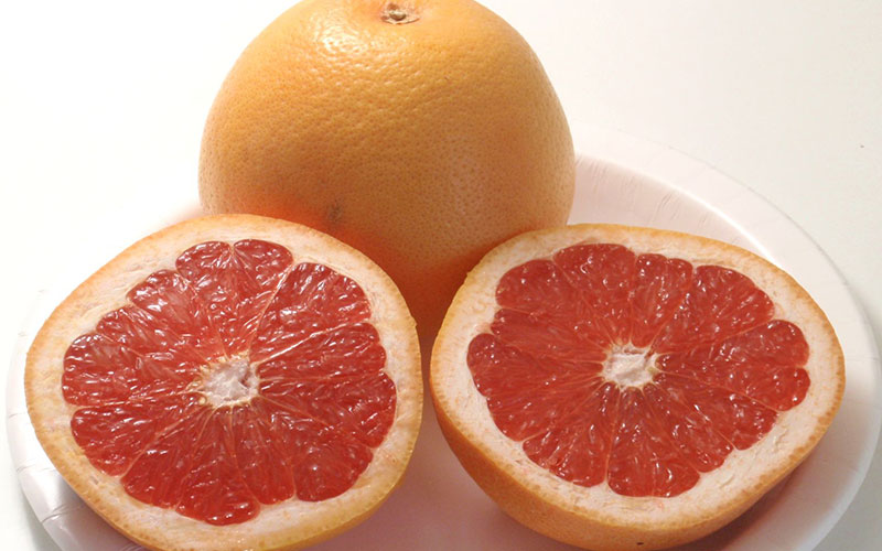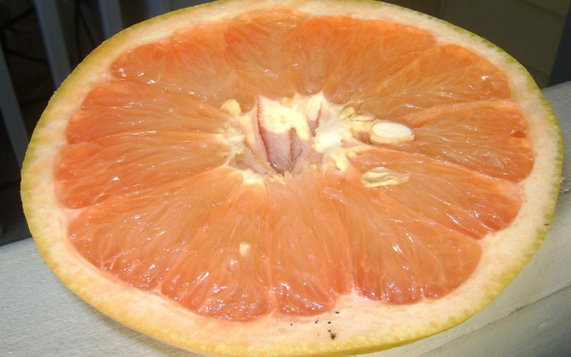 Seedless red grapefruit that is slightly lighter than the Flame. The Ray Ruby holds its color late into the season.The fruit has an exceptionally intense dark red, seedless interior and sweet flavor with very little bitterness. The rind is smooth and yellow with blush pigmentation.