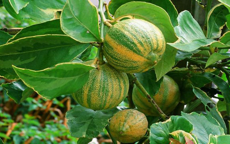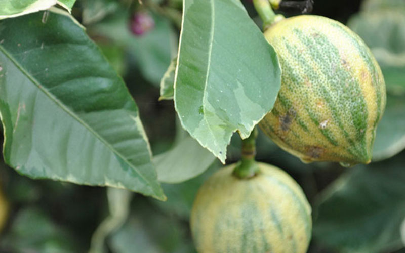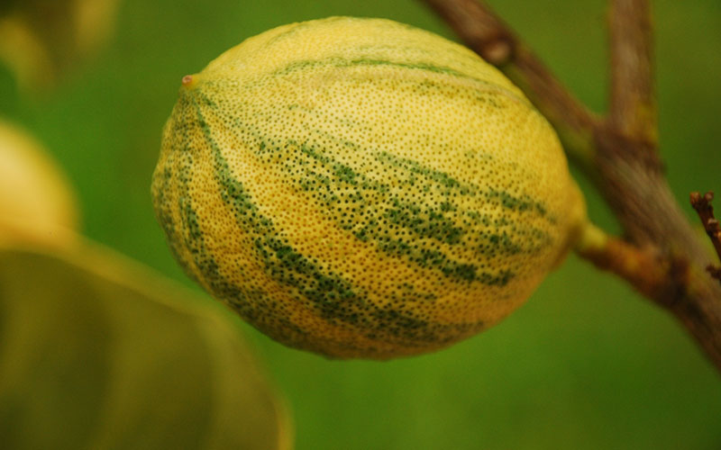 The variegated pink Eureka lemon tree's fruit is streaked with green when young.Green streaked with gold when young, it matures to pale yellow. Pink flesh produces clear juice.