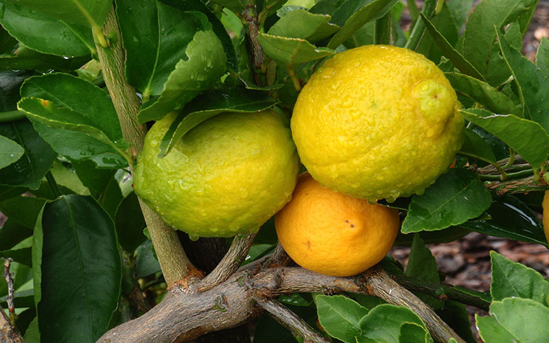 Very large, bumpy skinned lemon usually weighing 2-4 pounds. Flavor is typical lemon-like.This lemon citron hybrid grows well in containers and has a shrub-like appearance. The fruits are the size of grapefruits and are abundant on the tree nearly year round. Very Easy to pollinate by hand.
